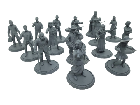 16 Miniaturas de Investigadores, podem ser ultilizadas para os jogos: Arkham Horror LCG ou Mansions of Madness first edition.